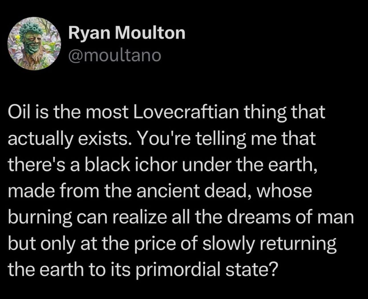 And yet, real people die. We get more and more unhealthy. Children go hungry. The oil people have killed and profited over keeps getting dug up and put in our cars. Some drops of it used to be a specific alive creature millions of years ago. The cars kill raccoons and deer that try to cross the road, who probably feel terror in their last moments.